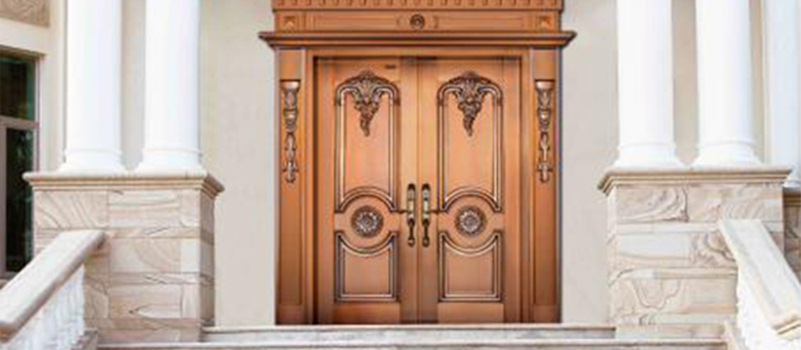 銅材具有質地溫潤,耐腐蝕,抗氧化,不變形等優良特性?,F代銅門根據銅材 固有特性結合古今之工藝,融合東西理念,加之現代技術與手工的完美結合使其具有 外觀典雅莊重,氣質渾厚,使用安全方便的特性,不僅僅是表面的豪華,更是一種 文化底蘊的彰顯,身份地位的象征!